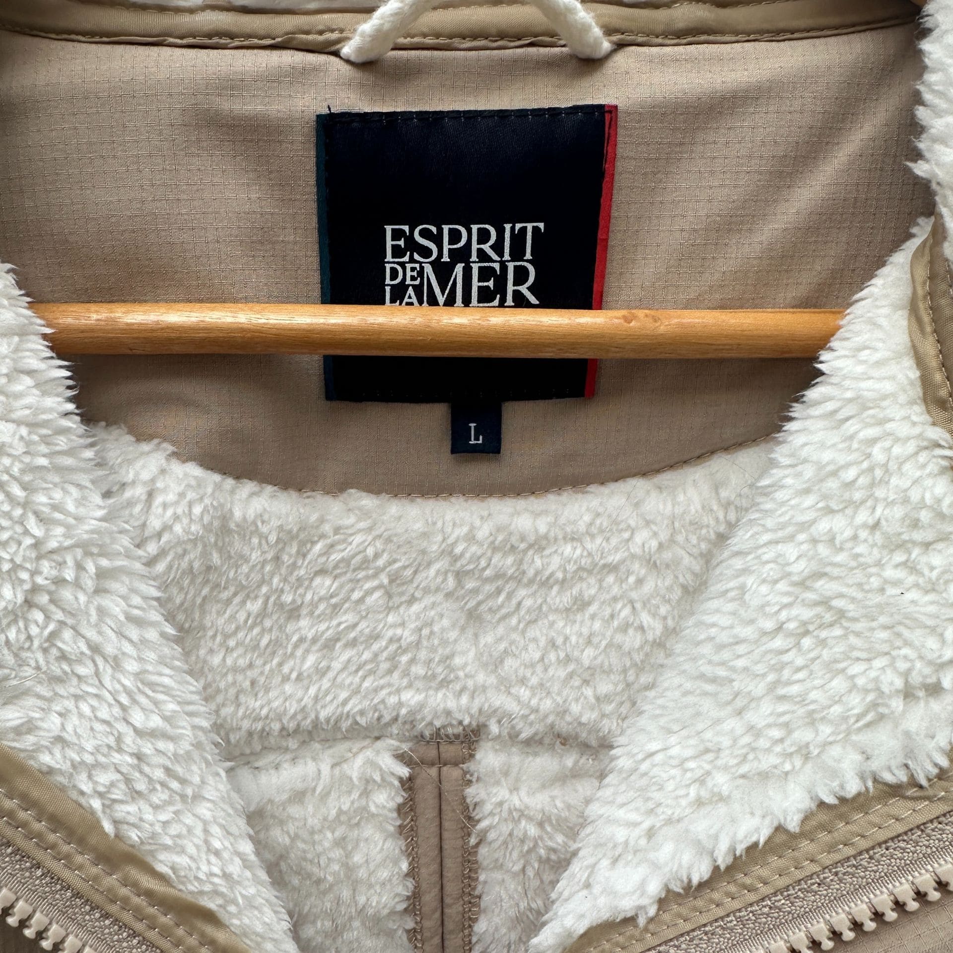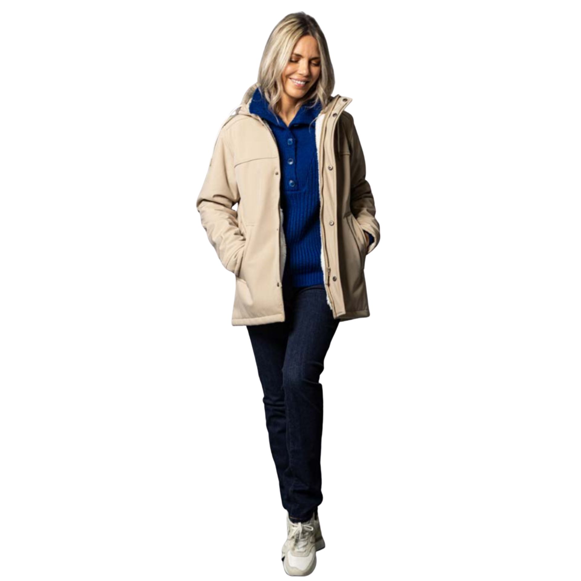 Parka Prado Esprit de la Mer en Almond Crème : manteau chaud doublé mouton, imperméable et coupe-vent, avec capuche, poches et finitions haut de gamme.
