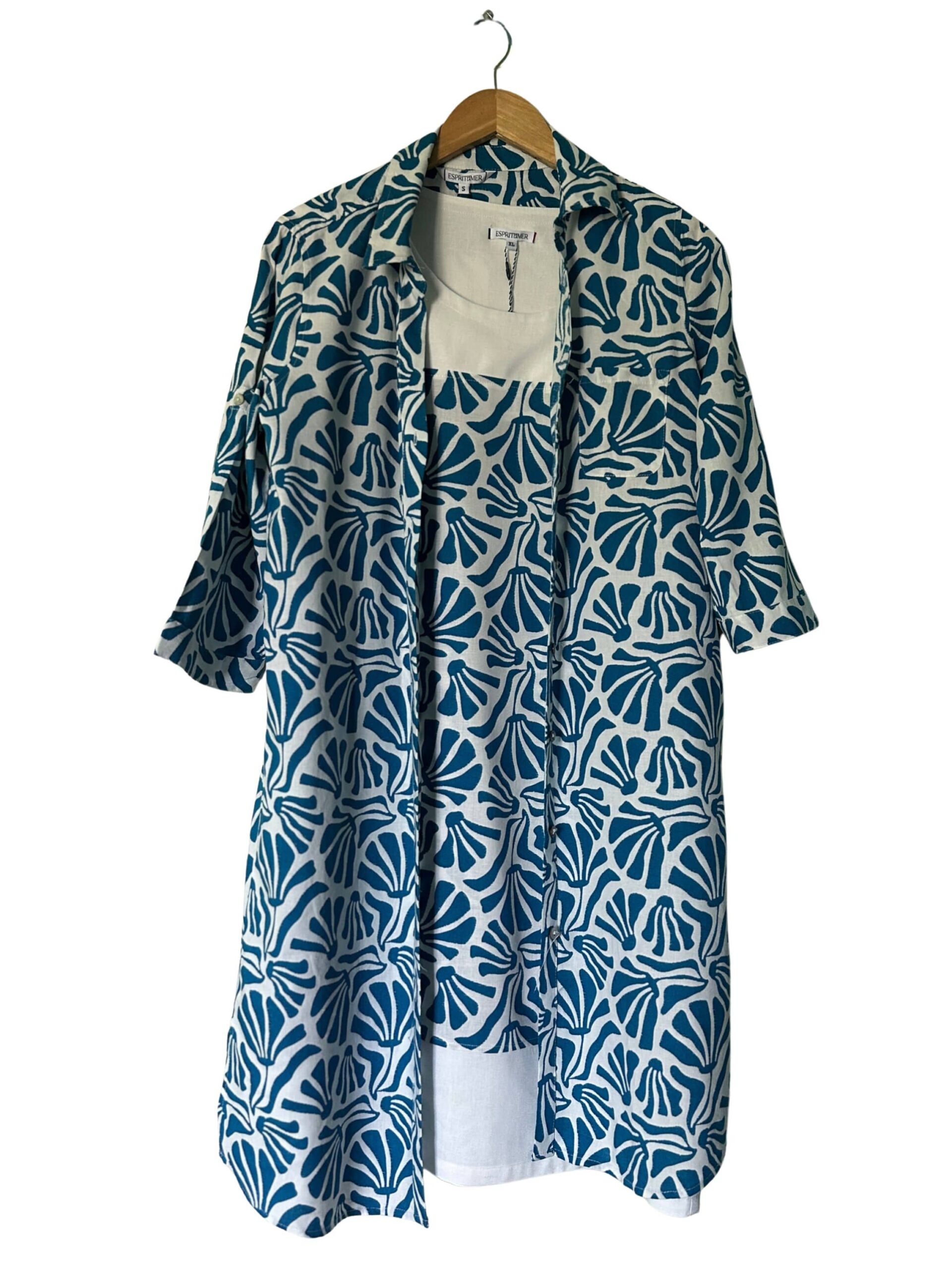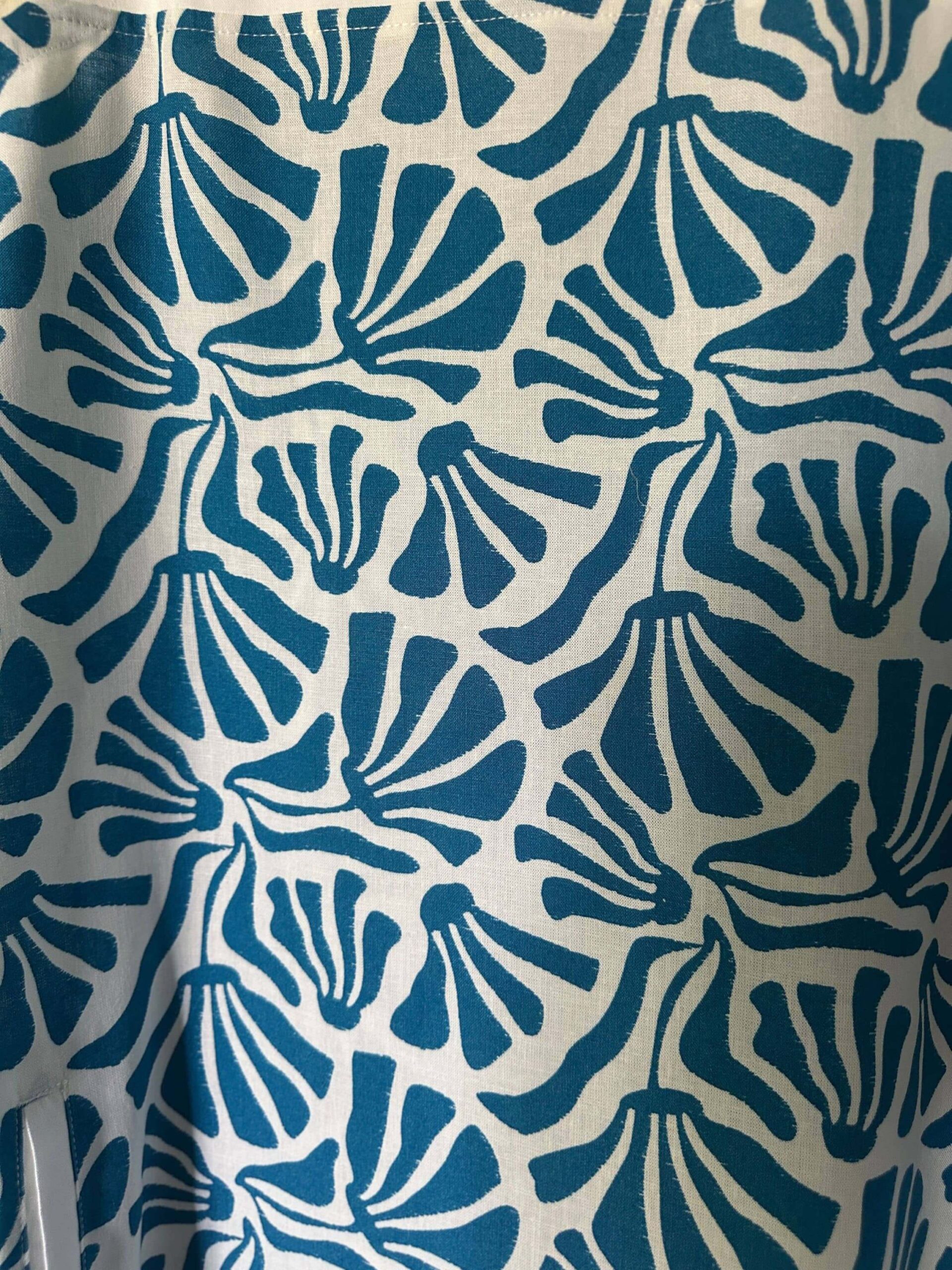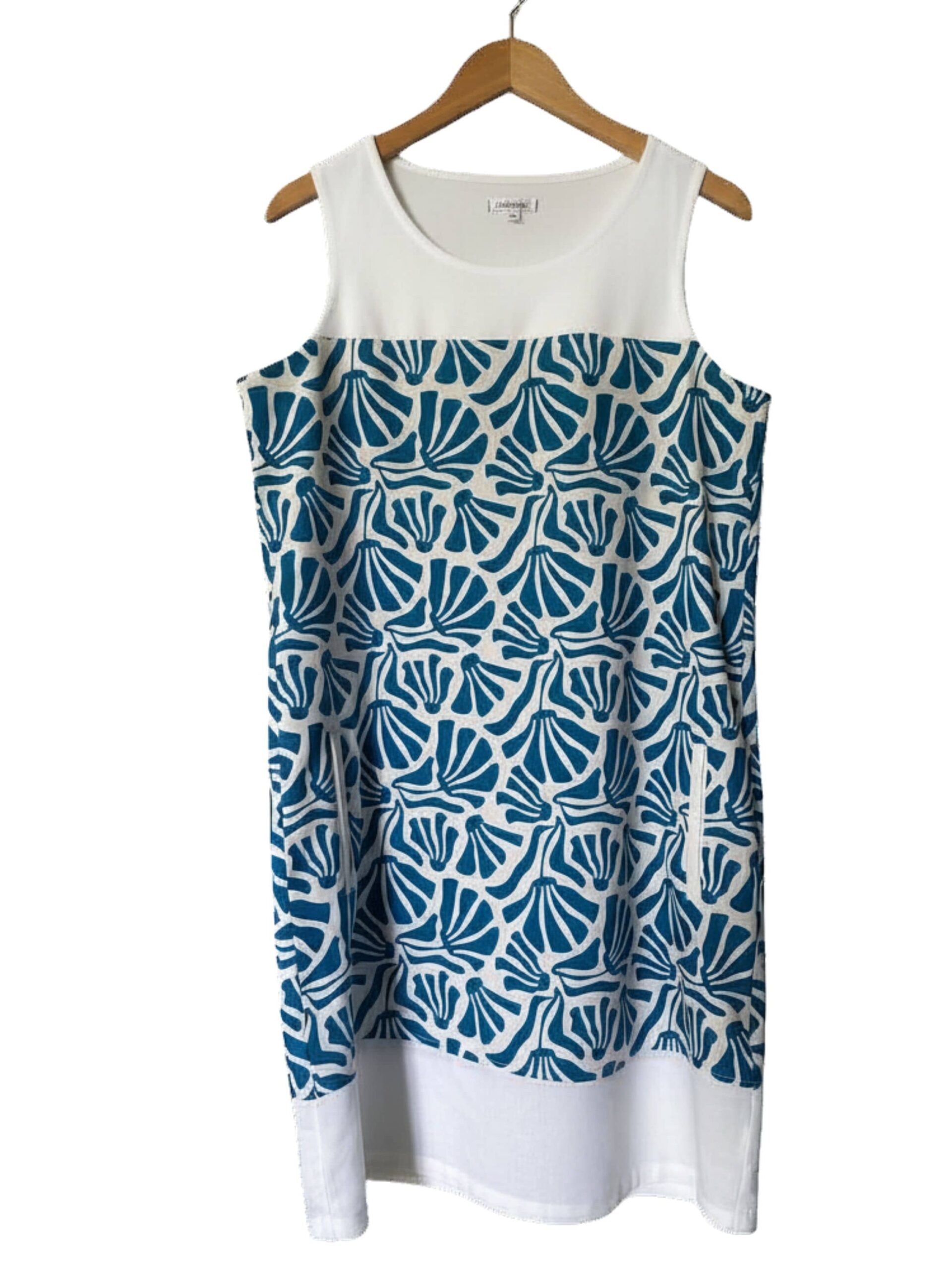 Robe femme bi-colore blanc et bleu à motif coquillage, en lin et viscose. Modèle Ramyou Esprit de la Mer, coupe fluide et légère, idéale pour un look estival chic et confortable.Robe Ramyou bi-colore en lin et viscose, blanc et bleu à motif coquillage. Légère, fluide et idéale pour un look estival chic – Esprit de la Mer.