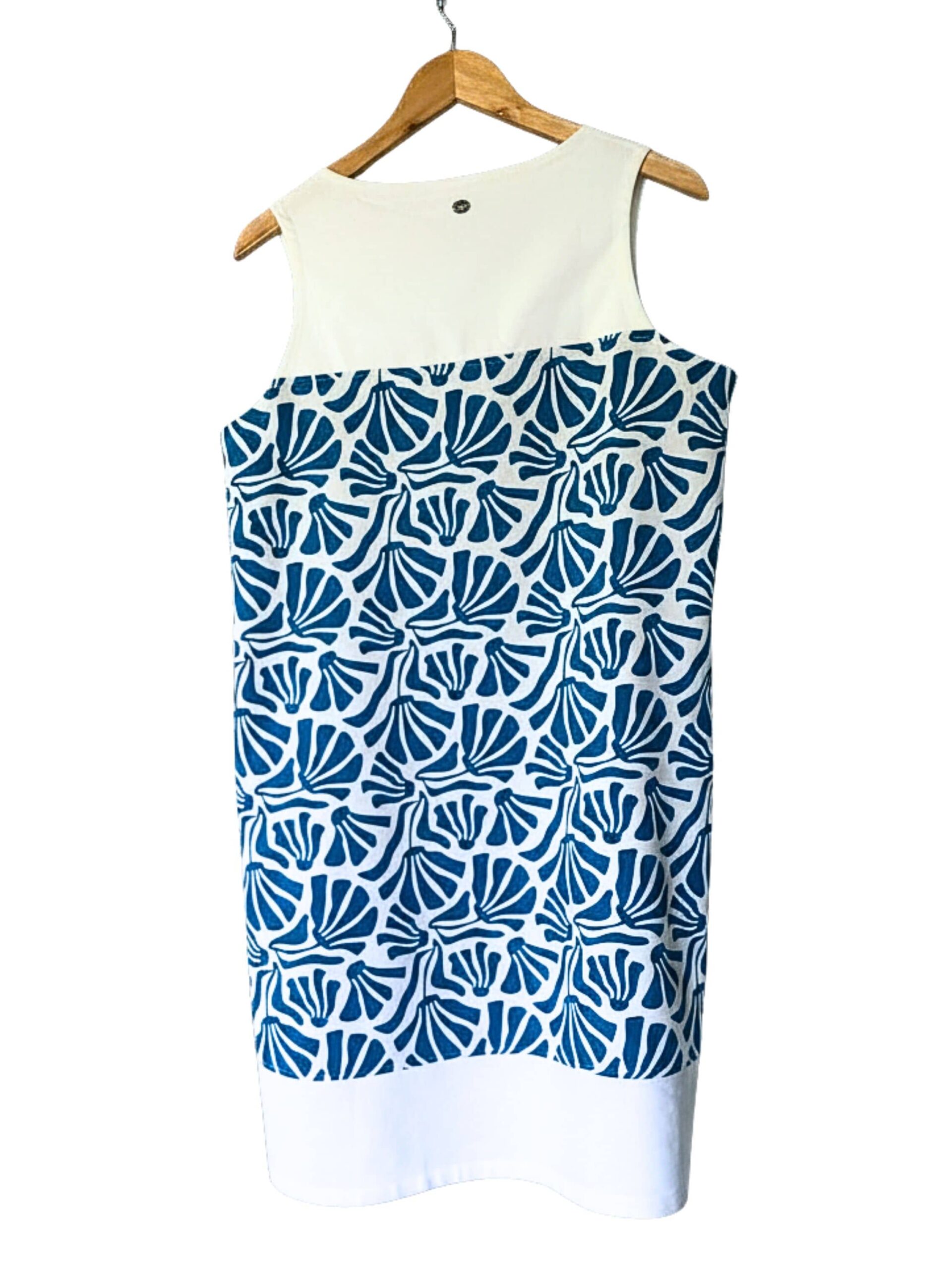 Craquez pour la robe Ramyou bi-colore de la marque Esprit de la Mer, une pièce estivale au style marin chic et intemporel. Cette robe sans manches associe élégamment un haut uni blanc à un panneau imprimé de motifs coquillages bleu profond, apportant une touche graphique et originale.
